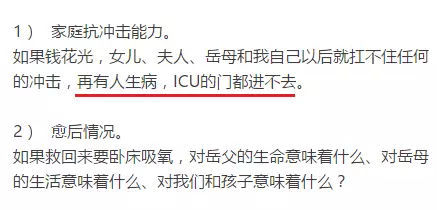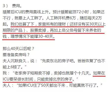 然而就是这样一个家庭,在岳父病重住进ICU病房后,所有流动资产加起来,也只够岳父“理想情况下撑30-40天”。超过40天,只能卖掉北京的房子了。