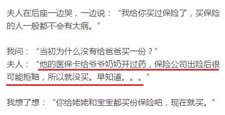 刷屏文中,作者问夫人当初为什么没有给岳父买保险,得到的回答是,“医保卡给爷爷奶奶开过药,保险公司出险后可能拒赔”……