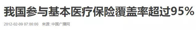 按有关方面的说法,早在2011年底,我国参与基本医疗保险的覆盖率就已经超过95%了,“政策范围内住院费用报销比例从60%提高到70%左右”。