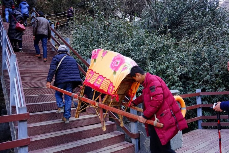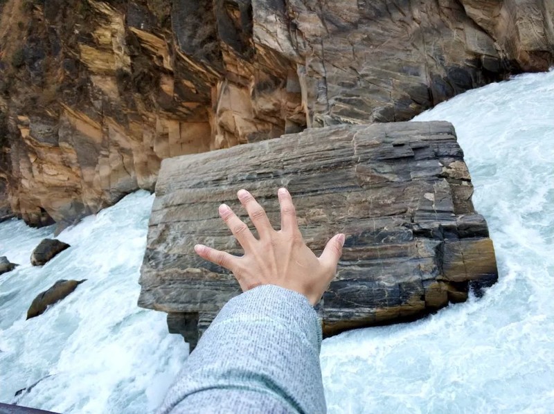 上虎跳是峡谷中最窄的一段,离公路边的虎跳峡镇9公里,其江心雄踞一块巨石,横卧中流,如一道跌瀑高坎陡立眼前,把激流一分为二,惊涛震天。传说曾有一猛虎借江心这块巨石,从玉龙雪山一侧,一跃而跳到哈巴雪山,故此石取名虎跳石。