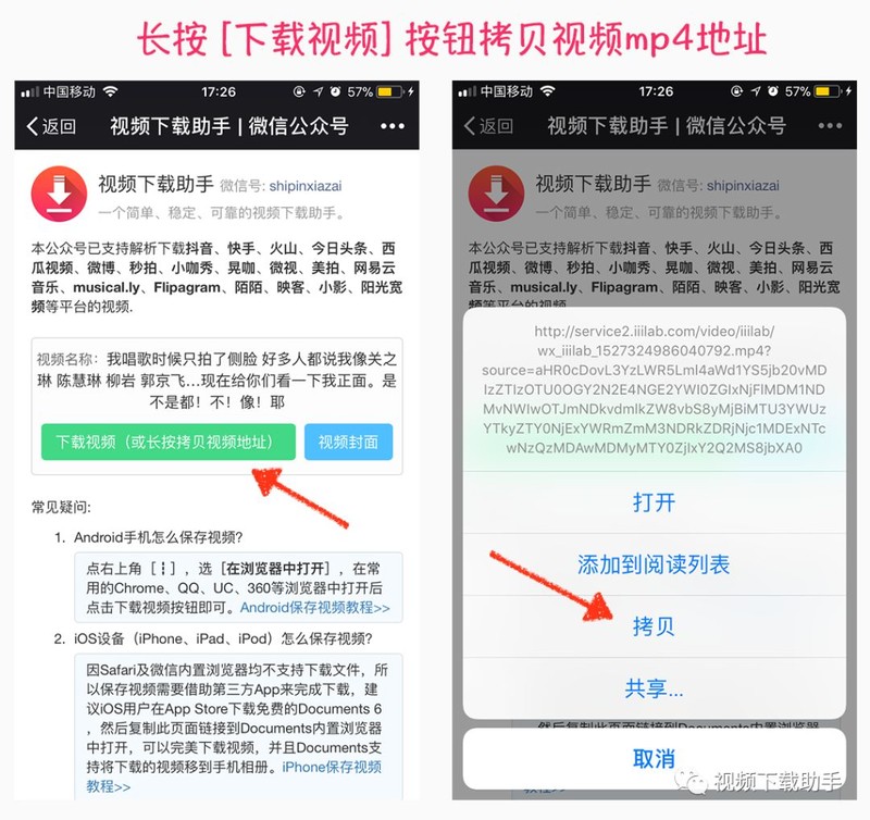 和Android手机一样,将要下载的视频分享链接发送给 [视频下载助手] 公众号。打开回复页面,长按 [下载视频] 按钮拷贝视频mp4地址。