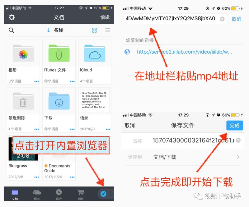 打开Documents App内置浏览器,粘贴刚才复制的mp4至地址栏 ,即可下载mp4文件。下载完成后,回到Documents的主界面,在"下载"文件夹里,就能看到刚才保存的视频了。