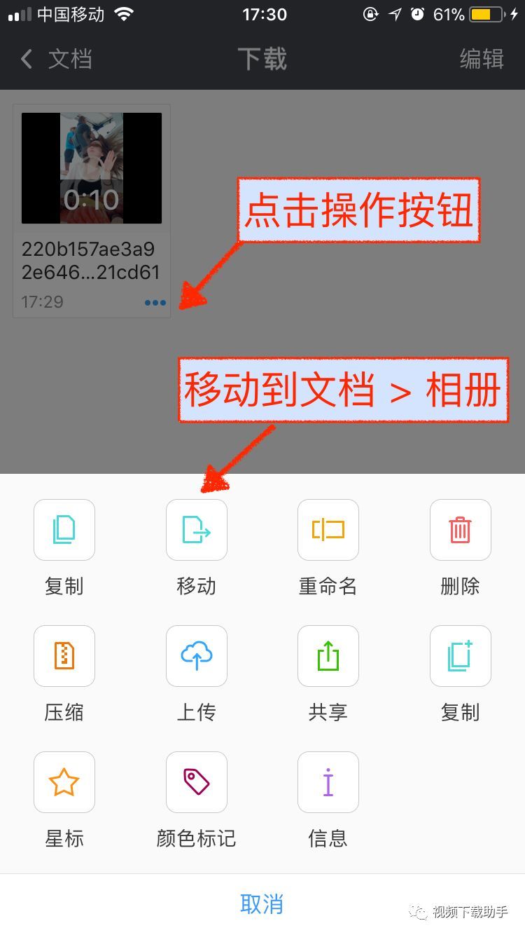 如果你想把这个视频移到手机相册,很简单,点这个视频右下角的三个点号(...),然后选择移动,移动到"文档 > 照片"文件夹里就OK了。这个时候,你就可以在手机相册里看到这个视频了。