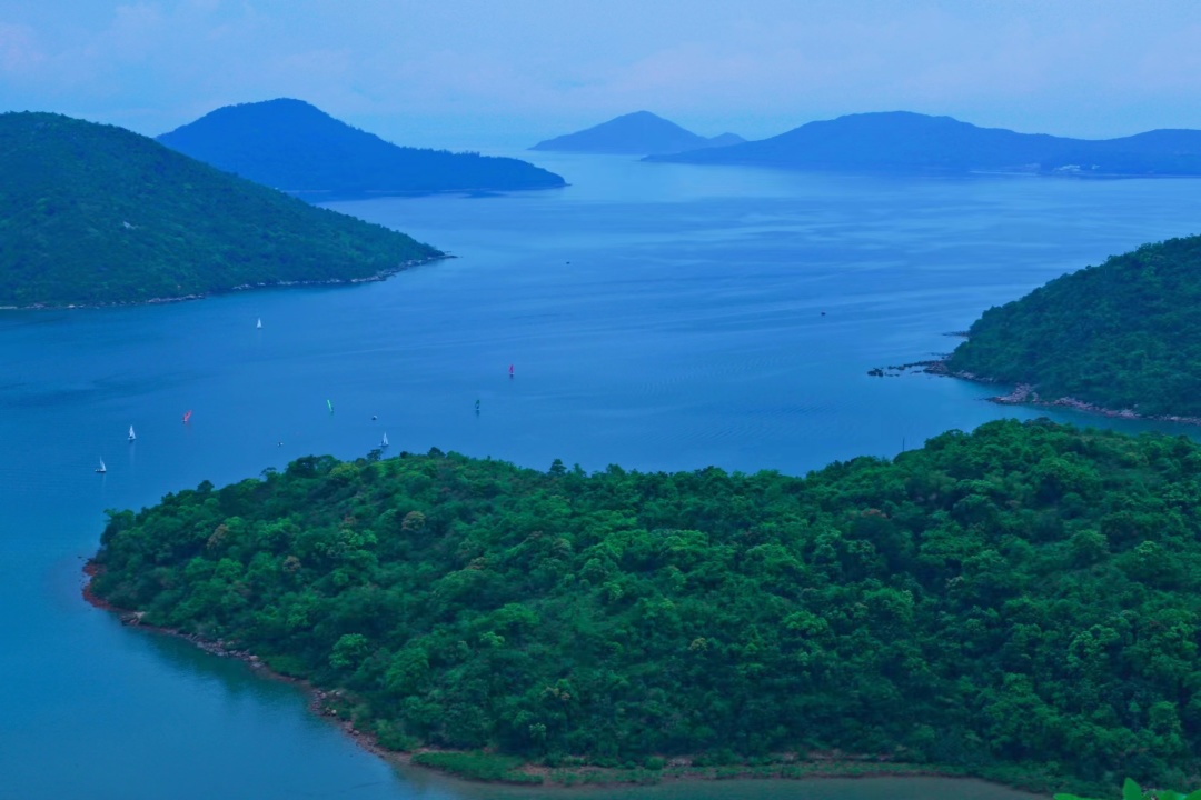 晴天下的万宜水库色彩活泼得让人惊艳,水色湛蓝,犹似天然湖泊,遇上天朗气清的日子,还可以远眺蚺蛇尖。
