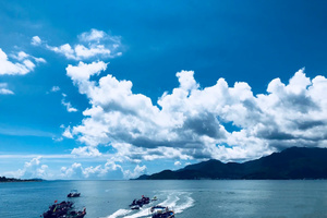 13:00午餐过后开始沿着鹿雁科考线登山道登山。从鹿嘴山庄出发,沿着石阶向上,穿越密林直达山顶。山顶两侧是大海、远处飘浮的小岛、天空的白云景色美极了。