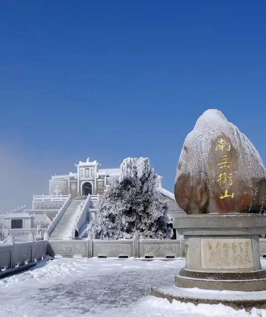 冬季的南岳衡山是一个晶莹剔透的冰雪雾凇世界,李白以“回飙吹散五峰雪,往往飞花落洞庭”的传神之笔赞誉南岳衡山冰雪美景。