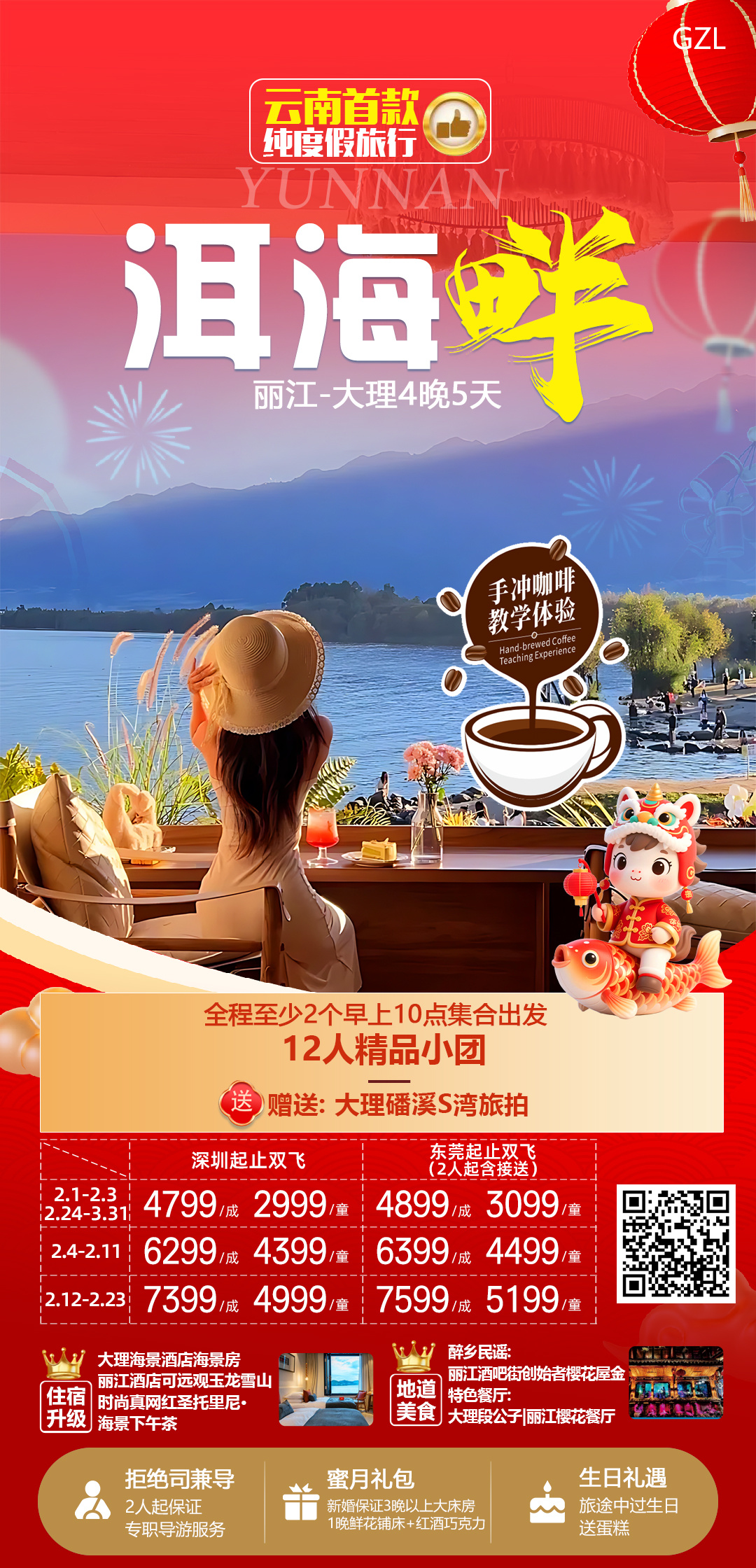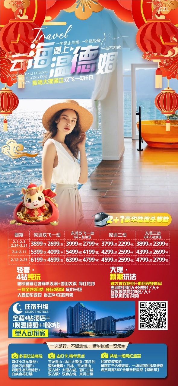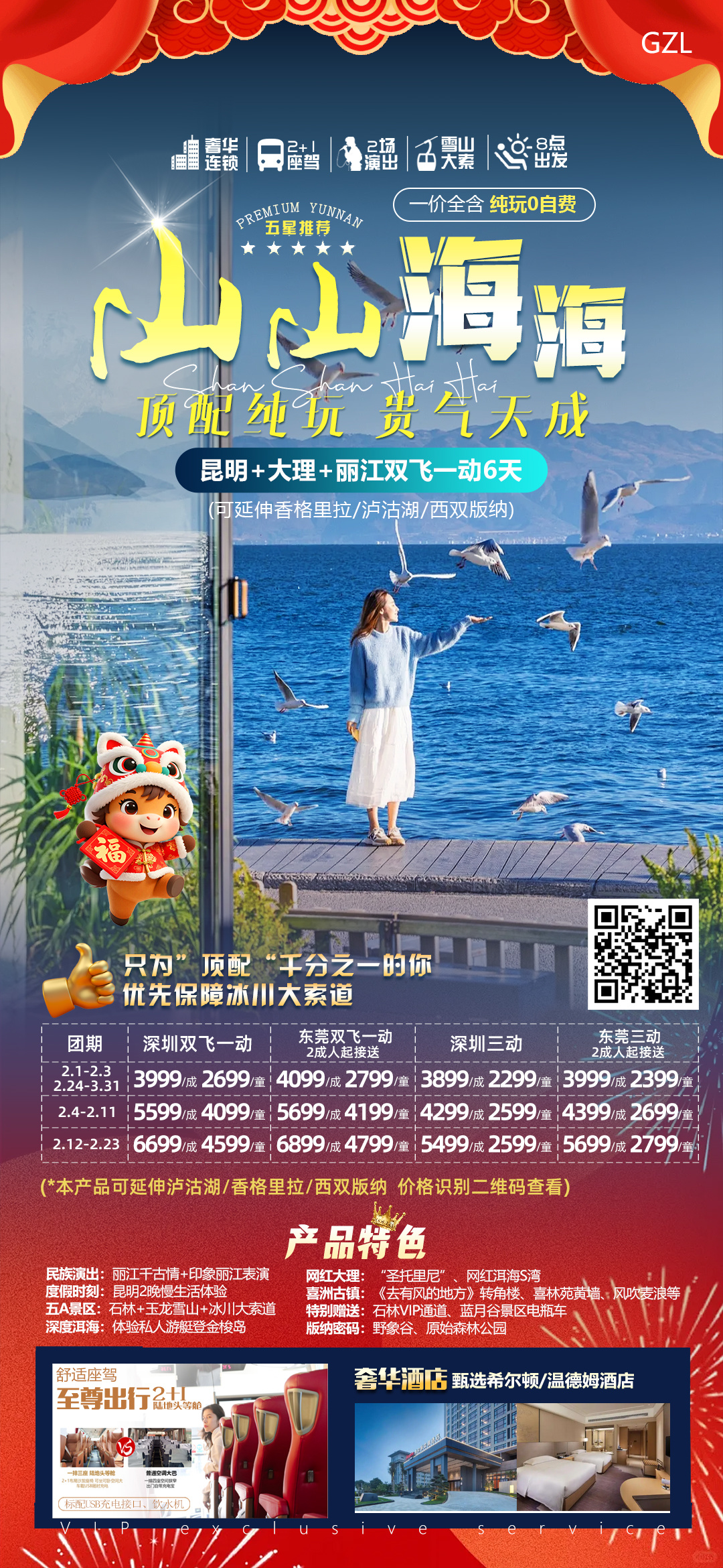 🏩昆明两晚5钻酒店+大理海景房+丽江特色客栈