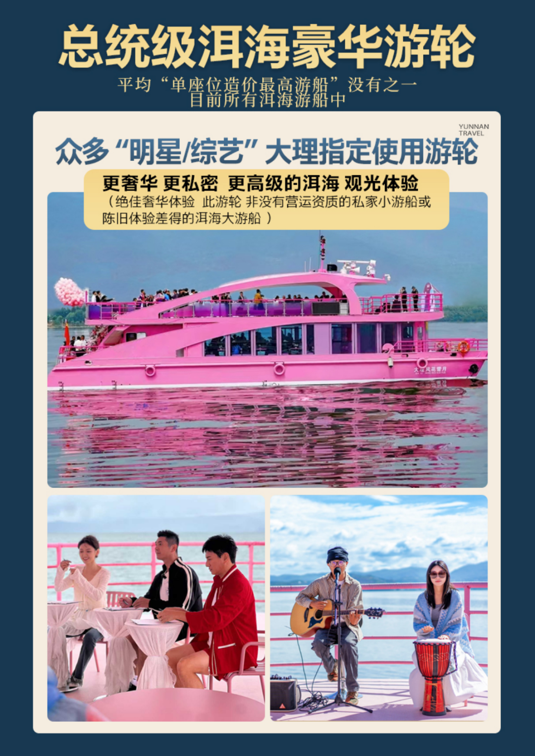 早餐后,乘车至游览 【洱海公园】 乘坐 【总统级 豪华游轮奢华游洱海】 ”吴奇隆明星同款“ 众多明星   综艺大理拍摄指定用船,1小时游轮洱海游览,体验非一般的 更奢华 更私密 更高级的洱海观光体验,远观苍山,绝佳奢华洱海游轮游览体验;   (此游轮官方售价228元/人票价,非没有营运资质的私家小游艇或陈旧体验差得的洱海大游船   成本较高 体验更加)(如遇游船位置紧张 安排粉色游船改游船登金梭岛游览)。​