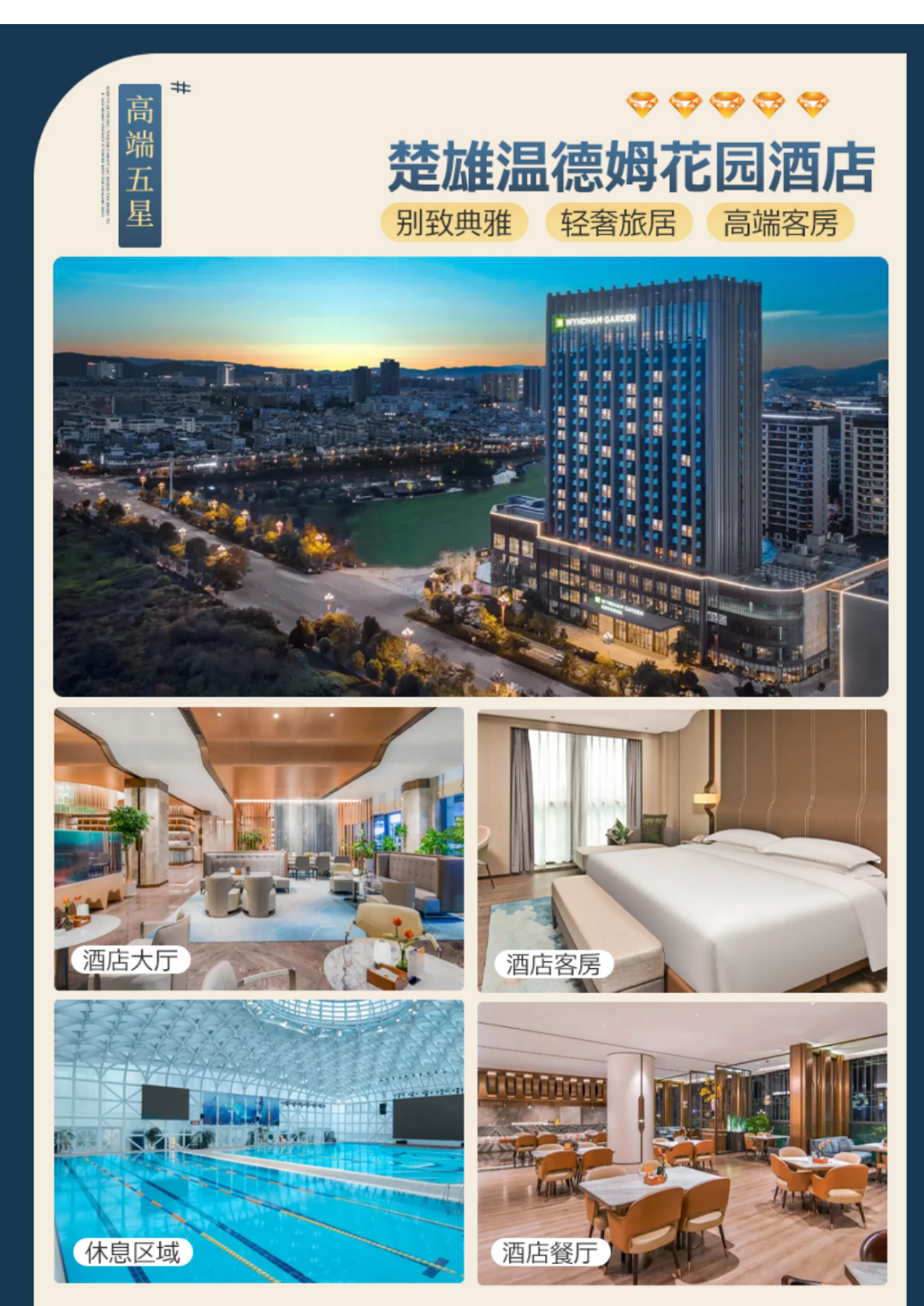 酒店参考: 楚雄5钻酒店:海悦文华温德姆花园酒店 (如遇楚雄温德姆满房, 改为安排同级5钻酒店, 5钻温德姆改为第五晚昆明安排)