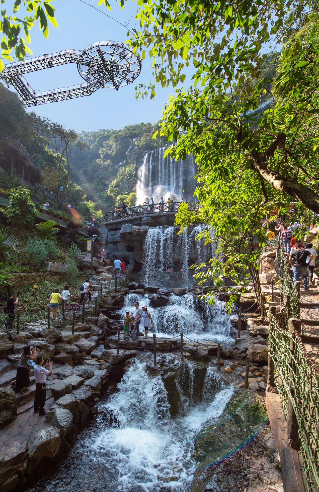 其中主瀑布为云龙大瀑布,单体落差131米(从瀑布顶到水帘洞底),宽45米,犹如狂野的巨龙从天而降,气吞山河,在悬崖峭壁的撞击下,飞入峡谷激起惊涛骇浪。