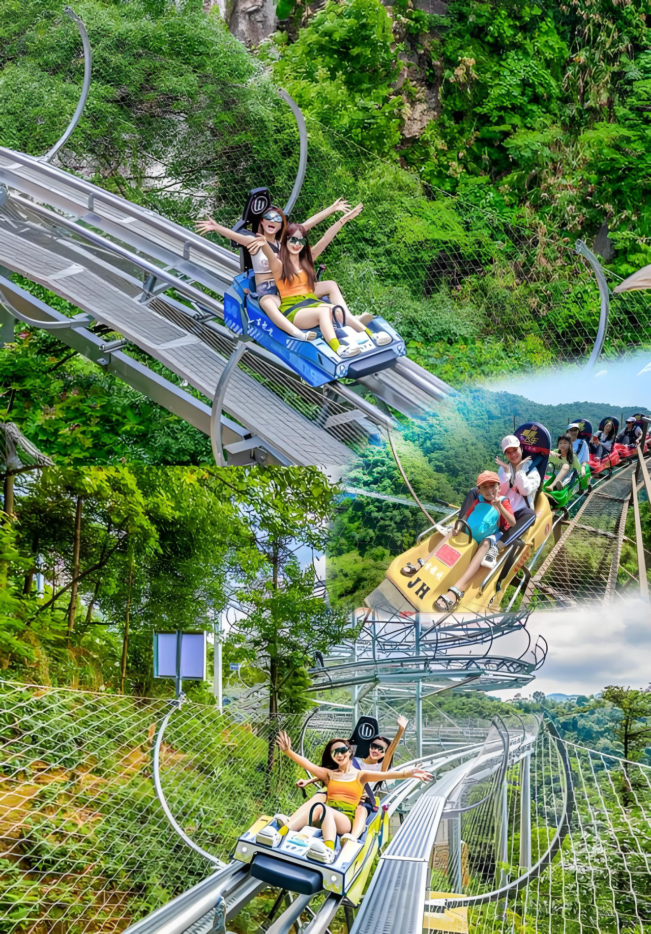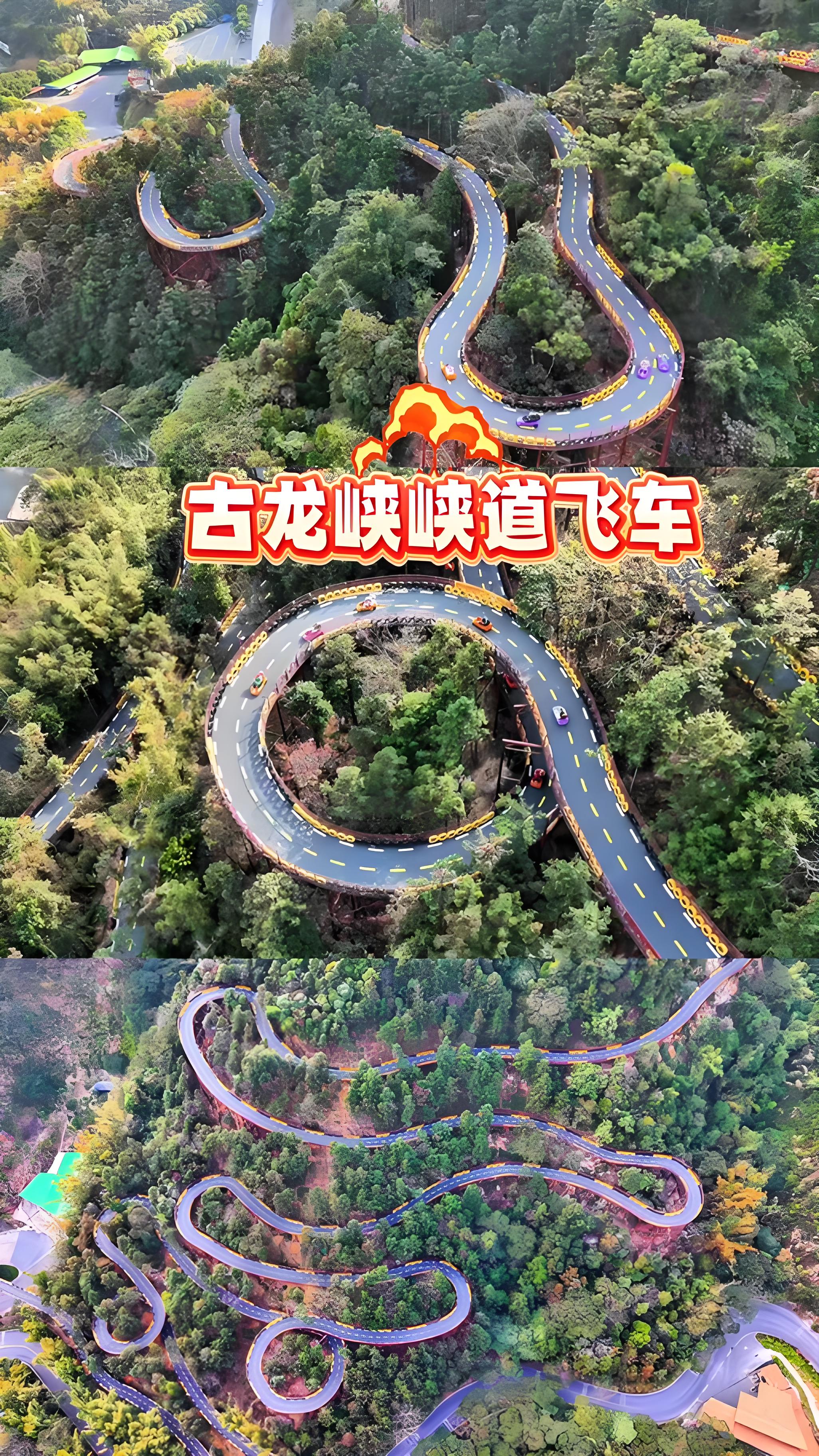 或选择古龙峡悬崖飞车,悬崖飞车是一项极具挑战性的游乐项目.位于古龙峡景 区内。悬崖飞车全长 3680 米跨越3座山峰,依山取势,蜿蜒起伏,全程落差高达 260米,最高时速可达 30公里每小时。赛道设计融合了多种复合型弯道.包括声角 弯、发夹弯、360皮螺旋弯、8字回旋弯等28 个板具挑战性的弯道.是日前国内最 长、弯道最多的山道滑车项日之一,悬崖飞车的起点与古龙峡的另一项刺微项日一峡 道飞车首尾相连 共网构成了景区的“双飞”组合。游客在体验完悬崖飞车后,可以 通过魔毯快速抵达峡道飞车的起点,无需耗费体力即可继续体验峡道飞车,真正实现了“山一步不用爬,景一处不落下。