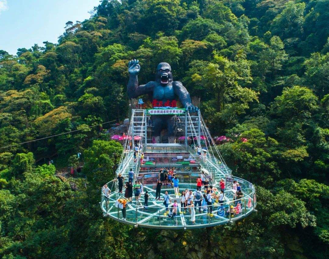 天王巨猩矗立在UFO造型的玻璃平台后方,用粗壮的臂膀紧紧拉住平台的底座,背山面瀑、叱咤风云,展示出威风凛凛的王者风范,寓意着吉星(猩)高照