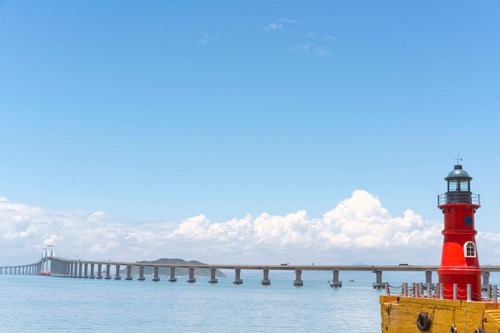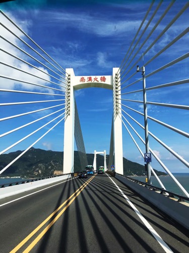 途经南澳大桥,感受南澳大桥宏伟壮观,这是广东省内第一条真正意义上的跨海大桥,是连接广东唯一海岛县南澳县和大陆的跨海大桥。全长约 11.08 公里,其中桥梁全长 9341 米,连接线全长 1739 米。全线采用设计速度 60 公里/小时的二级公路标准,路基宽度 12 米,桥梁净宽 11 米。总投资 15 亿元;