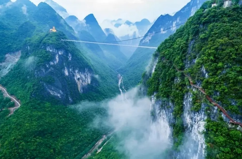 登云天渡玻璃桥天云渡玻璃桥长 588 米、高488米,为世界最长最高的玻璃吊桥,堪称世界奇迹!跨过天云渡到达缥缈峰,可挑战1999级悬崖绝壁栈道天梯及穿过灵鹫宫天然喀斯特溶洞。悬崖天梯盘旋在断魂崖绝壁之上,39道拐如飞龙般缠绕在山腰之间,颇有一夫当关、万夫莫开之势。灵鹫宫是缥缈峰的灵魂,坐落在缥缈峰断魂崖万丈绝壁之上。是一个天然喀斯特溶洞,每当气温骤降,洞口便会呈现吞云吐雾的神奇景象,当地人传说,那是神仙在洞里隐居修仙所吐出的真气。