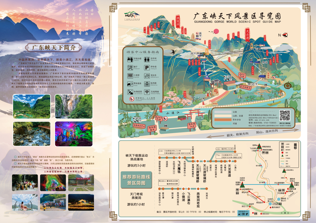广东峡天下景区位于清远阳山到广东第一峰必经路的岭背镇,景区依托广东境内罕见的喀斯特峡谷群、峰从地貌、悬崖绝辟,天然河道和神秘溶洞等自然资源,着力打造国内一流的自然风光和极限体验生态旅游景区。