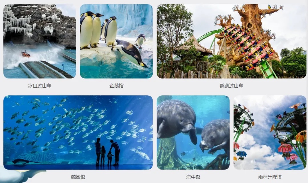 7.全球盖例大型游乐设施与珍贵动物展区相结合的独特设计,如:您可以在过山车上联过会球首座北极期山川、亚马逊海底、深海珊瑚问、海狮海象领地、在感受风驰电掣、动感刺融的同时,融入主题情感