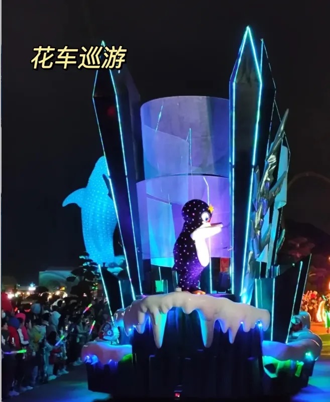 4.世界最长的花车巡游路线,花车数量多达26辆,演员阵当达96人,主题故事丰富多样,其中包括美人鱼、海龟、草鱼、巨鲸、极地游戏,潜水粗
