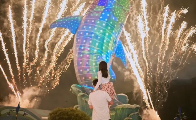 20:00在珠海长隆海洋王国内观赏[烟花汇演海洋幻彩烟花秀](最终的表演时间根据景区具体安排)烟花汇演,结合音响,激光、灯光效果、烟花、花式喷泉、视频特效、水上飞人等元素,燃放切模将比平日更大。塑花做中将出现,“热烈祝贺海洋王国盛大开业*烟花字样,现场配合有精彩的水上飞人表演,勇猪的水上表演者骑飞艇在水面上做出翻转、腾空等高堆度动作,飞驱电尾郎同时会发射出彩色烟花,形成冲击力十分强的视觉效果,整个烟花燃放过程,讲述了一个关于海洋王国国民团结一心战胜邪恶的火魔,共同打赢一场善恶之战并喜悦庆祝的故事,烟花的主要色彩为红色、银色、金色、翠绿色和紫色,空中覆盖半径最大达到55米,形式新颖多样,包括笑脸、瀑布、水上烟花、彩色落叶、锦冠花束等,海洋王国的地标大鲸鲨森里将首次映射出闪亮的银尾烛光,幻彩的焰火如闪烁的流星划过,照耀山烂的夜空,为这场华丽、神奇的盛典增添欢乐的气氛,欢迎广大市民与海洋王国的国民们共同见证这一充满喜庆和洋溢激情的时刻
